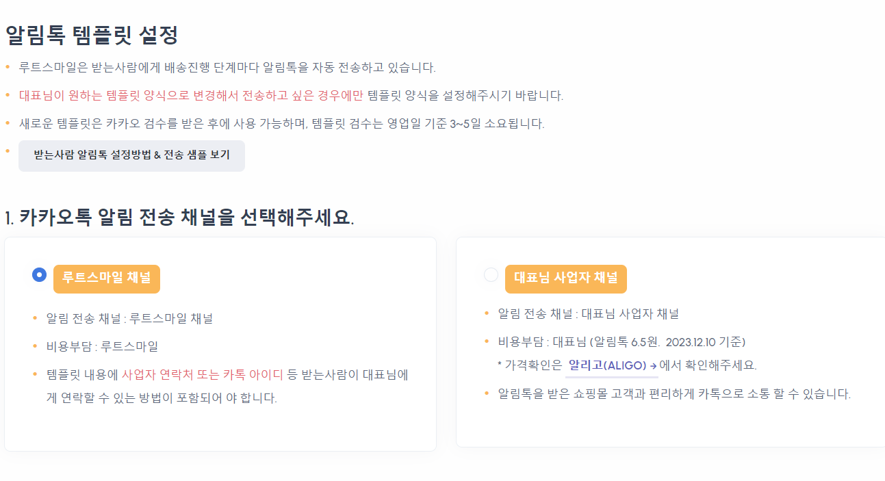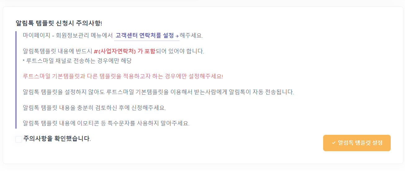 - 알림톡 템플릿 신청시 주의사항을 확인 후 알림톡 템플릿 설정 버튼을 클릭해주세요.