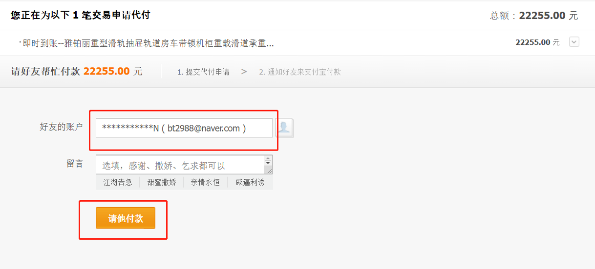 알리페이 대리결제 정보를 입력합니다.