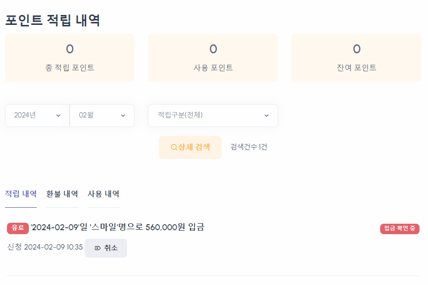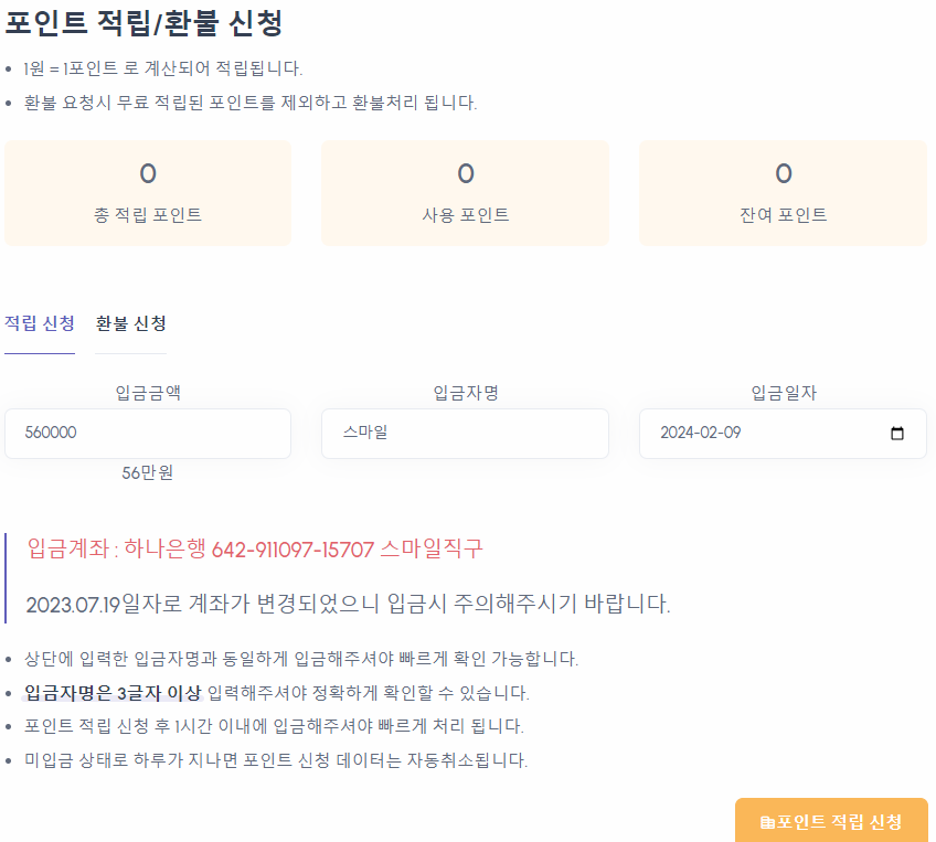 - 미입금 상태로 하루가 지나면 포인트 신청 데이터는 자동취소됩니다.