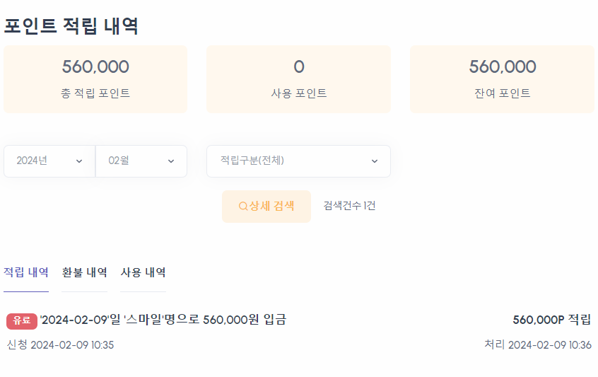 - 포인트 적립내역 화면으로 이동되며, 처리상태를 확인할 수 있습니다.